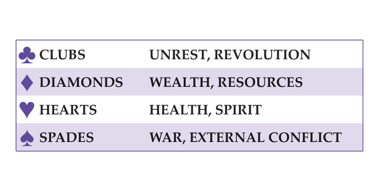 At the beginning of the game, you'll roll a die for your kingdom's ambition and draw cards for your kingdom's troubles.